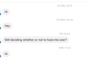 Every now and then I would get a message from him. He was explicit. Telling me what he’d like to do to me. How he could come round now and give me the time of my life. It got boring and I mostly ignored it.